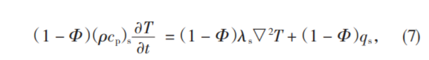 兩種能量增加帶來的溫升是基于多孔介質(zhì)材料內(nèi)的固體部分。假設(shè)固體部分的密度表示為ρs,其比熱容表示為cs。假定研究對象熱物性參數(shù),如比熱容、導(dǎo)熱系數(shù)等,不受到時間和空間改變帶來的影響,多孔介質(zhì)本身始終為各項同性的,并且多孔介質(zhì)材料內(nèi)部細(xì)小孔隙的容積均被流體填充,則有: