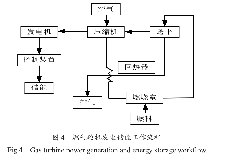 燃氣輪機發電儲能是通過燃料供給系統將天然氣輸送到燃燒室。天然氣在燃燒室內與空氣混合燃燒,產生高溫高壓的燃氣。這些高溫高壓的燃氣迅速膨脹,并流經透平葉片, 推動透平旋轉。透平葉片通過軸連接到發電機,透平的旋轉帶動發電機的轉子旋轉,從而在定子中產生電流,完成電能的轉換。最終將電能儲存到儲能系統中,以便在電力需求高峰期或電網出現故障時進行釋放和使用。如圖4所示。在燃氣輪機發電儲能過程中,儲能系統可以幫助平衡燃氣輪機發電的輸出波動。燃氣輪機的啟動和停止時間較長,且燃料燃燒效率和發電效率容易受環境溫度和負荷變化的影響。通過儲能系統的調節,可以在短時間內補償輸出功率的波動,確保電網的穩定運行。在負荷較低時,燃氣輪機的效率較低, 部分燃料會被浪費。儲能系統可以在這種情況下存儲多余的電能,并在電力需求高峰期釋放,減少燃氣輪機的啟動和停止次數,從而提高整體的能源利用效率。